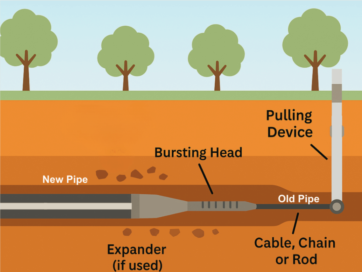Instead of opening a long trench, the process uses two small access points. The bursting head fractures the damaged pipe, creates space, and allows the new pipe to slide in directly behind it.